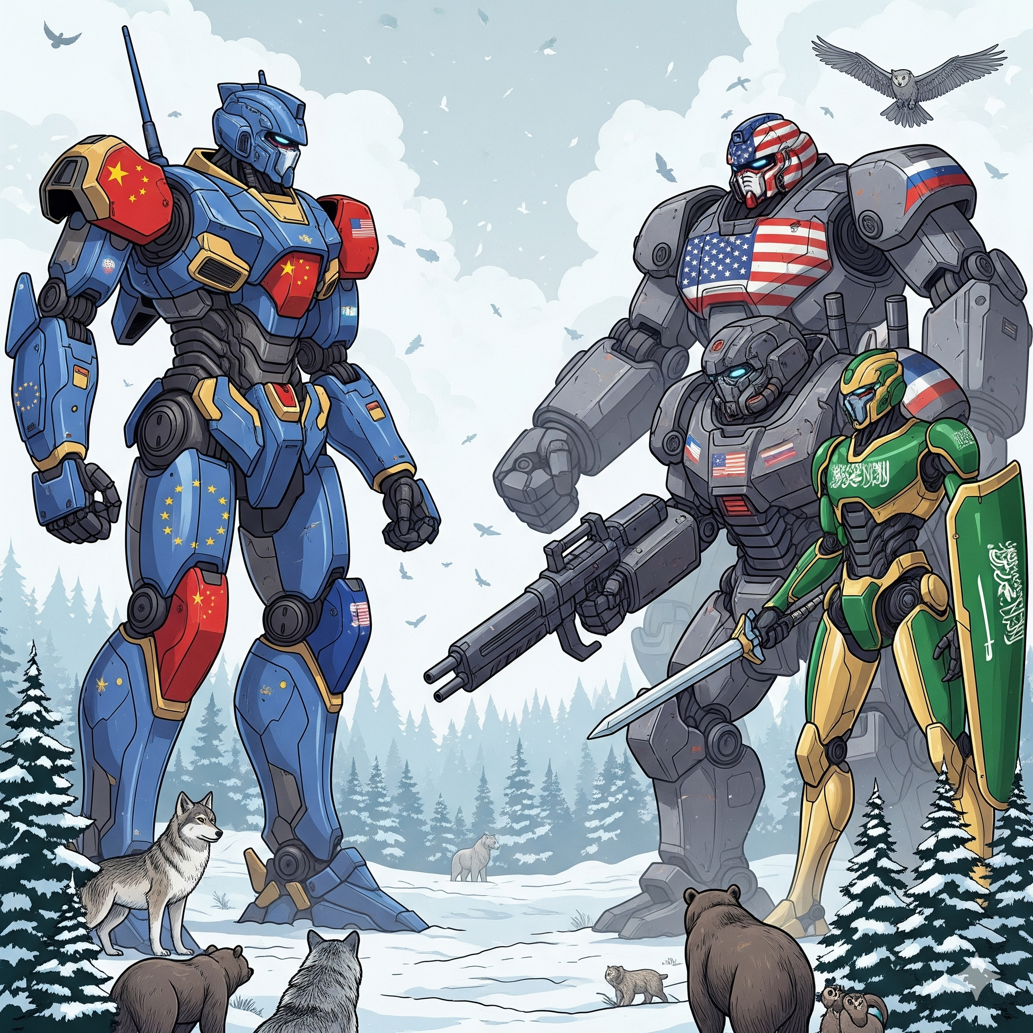 Opposing this is a petro-axis comprising the United States, Russia, and Saudi Arabia, united by their dependence on fossil fuels and resistance to decarbonization. Each pursues its own interests: the U.S. oscillates between climate action and fossil-fuel nationalism; Russia relies on hydrocarbons for power and influence; Saudi Arabia aims to remain the last major oil producer. Together, they form an ideological and economic coalition defending carbon-based industrialism, framing the green transition as a threat to sovereignty and identity.