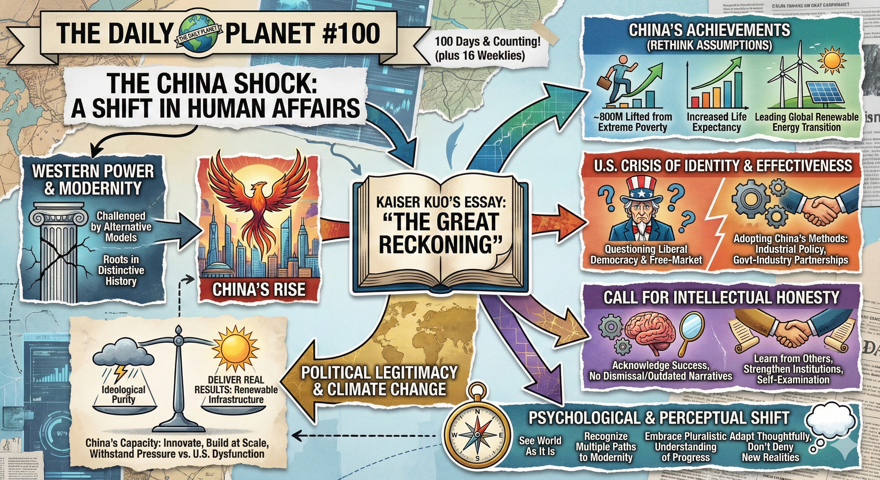 There's so much to say here, but you absolutely have to start with this remarkable essay by Kaiser Kuo. In "The Great Reckoning" Kuo says the world is undergoing a profound transformation as China rises to challenge long-held Western ideas about development, governance, and modernity. China's remarkable achievements - lifting nearly 800 million people out of extreme poverty, dramatically increasing life expectancy, and leading the global renewable energy transition - demand that the West rethink its assumptions. This shift is not just about power but about how societies organize themselves and define progress.